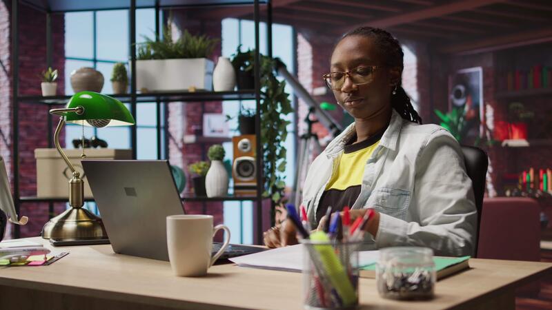 Remote accountant at home checking invoices and entering data on laptop, managing client accounts. Bookkeeper in apartment crosschecking figures between notebook screen and paper files, camera A Pro Video