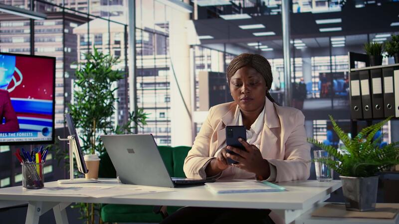 African american general manager answers smartphone call to discuss performance metrics, focusing on business development project. Director multitasking daily operations and analytics. Camera B. Pro Video