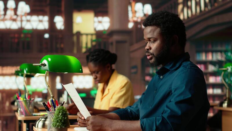 University student researches academic topics in a traditional library, using the classic study space to review lessons and organize course materials. Completing class notes for exams. Camera B. Pro Video