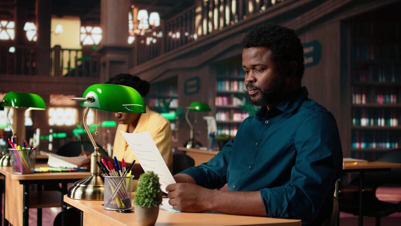 University student researches academic topics in a traditional library, using the classic study space to review lessons and organize course materials. Completing class notes for exams. Camera A. Pro Video
