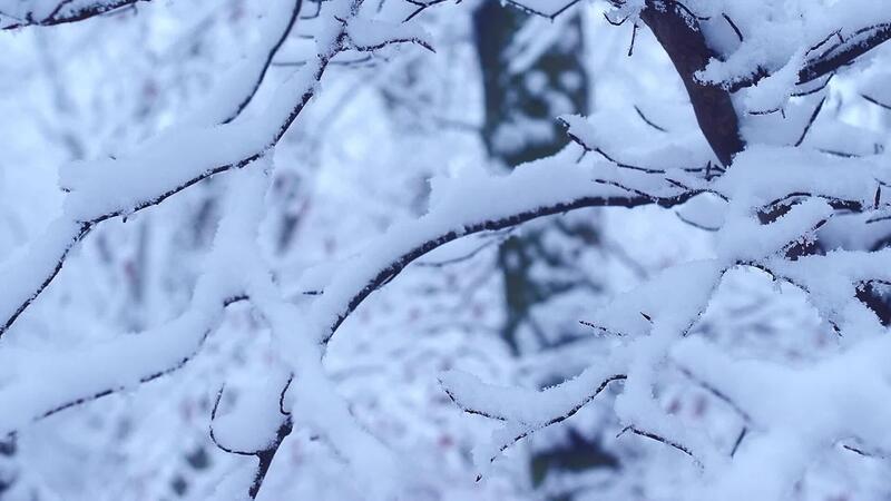 The branches of a tree in the woods under a layer of snow sway in the wind, the camera panning Pro Video