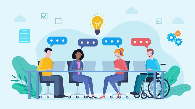 Clip of people working at a desk on laptops with dialogue clouds appearing next to them. A light bulb appears in the center of the screen and document and gear icons appear on the sides. Pro Video