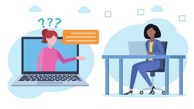 Client and customer support. The client appears on the laptop screen with a speech bubble and question marks. Next to her, the employee at the desk with answers. Five stars of satisfaction. Pro Video