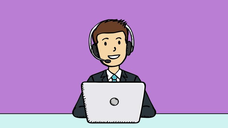 Doodle of customer service representative works on laptop. He has headset on. He talks to customer. Conversation animation is in easy to edit loop. 2D cartoon style animation. Pro Video