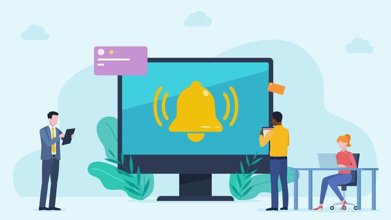 Notification alert appearing on the monitor screen. Customer comments appear around the monitor along with a five-star rating. Next to it, employees analyze data. Animation in flat style Pro Video