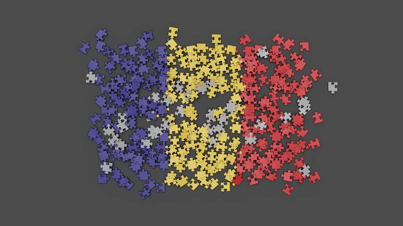 Animation of a Romania flag falling onto the surface, assembled from a puzzle with an alpha channel and a shadow. Wind blows the scattered pieces out of frame Pro Video
