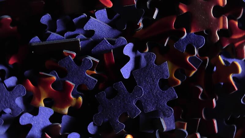 Background of Colored Puzzle Pieces that Rotating Clockwise - Top View, Close-Up. Texture of Incomplete Red and Blue Jigsaw Puzzle with Low Key Light - Right Rotation Pro Video