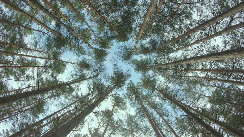 Low Angle View of a Pine Forest when Looking Up to the Trees. Bottom View of Pine Crowns at Sunny Summer Day. The Sky Can Be Seen Through the Tops of the Trees. Gimbal Stabilizer Rotation to the Left Pro Video