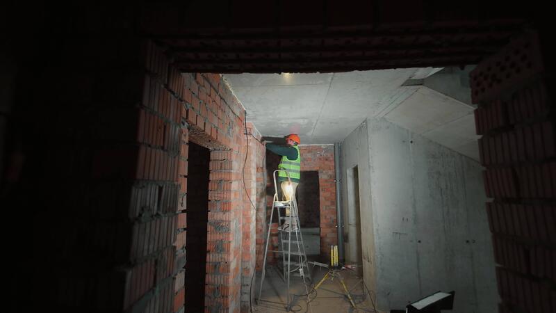 Worker on ladder installing cables inside unfinished building, Worker installing electrical wiring on ceiling of brick structure Pro Video