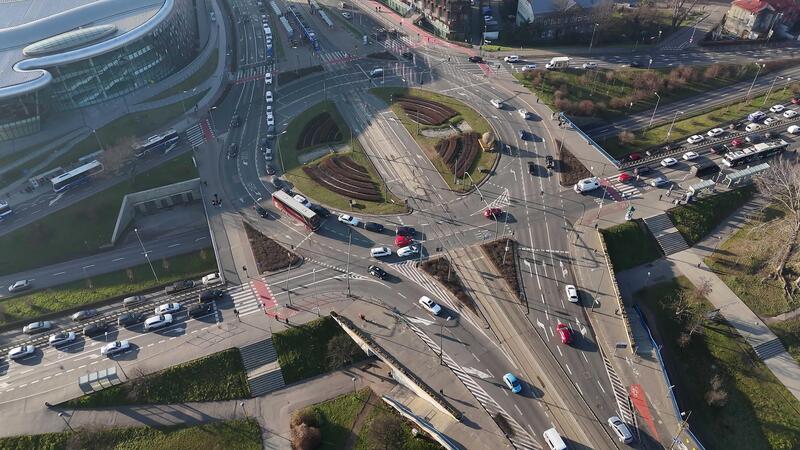 Aerial view of a large traffic roundabout with multiple lanes and tram tracks in Krakow, Complex roundabout with cars, buses, and trams navigating a multi-lane intersection in Krakow, Poland. Pro Video
