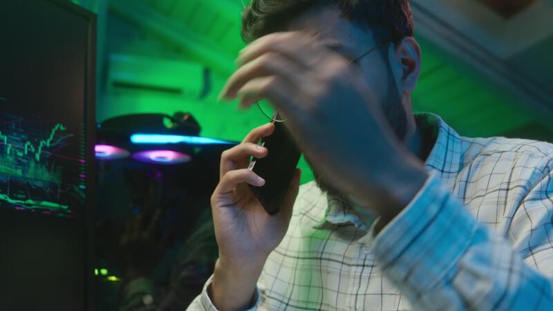 Stressed Arabian Indian man male guy looking code coder programmer technology talk mobile phone error hacker problem loss worker computer trouble IT specialist worried overwhelmed crypto currency work Pro Video