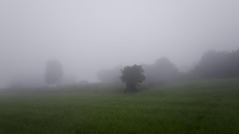 Fog enveloping a landscape, gradually obscuring trees and creating a serene, atmospheric scene in nature Free Video