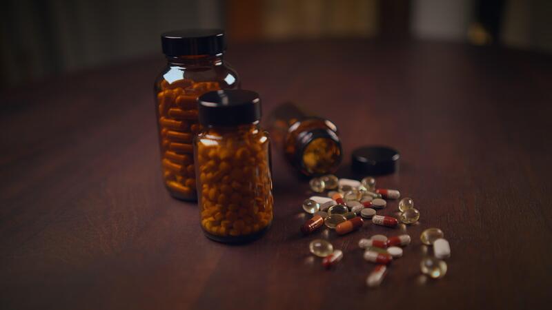 An Array of Different Bottles of Dietary Supplements Displayed on a Wooden Surface Pro Video