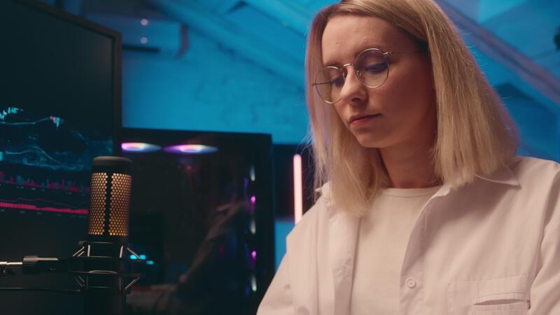 Caucasian business woman girl crypto currency bitcoin trading late night work insomnia programmer hacker coder influencer stock broker streamer typing computer internet addict tired shrug shoulders Pro Video