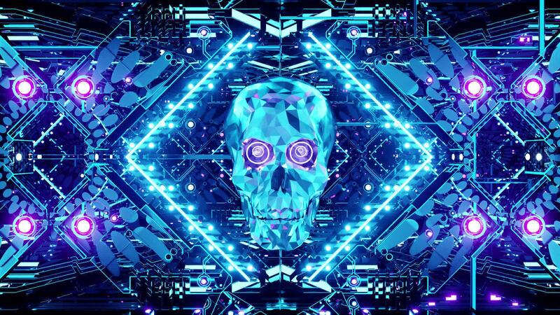 An animated background of crystal skulls and detailed neon light patterns on a seamless loop Free Video