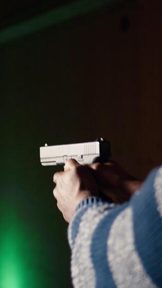 Vertical Man in shooting gallery using firearm, looking at results on moving target. Close up of person training for competitive shooting sport, sharpening skills, checking points scored on bullseye, camera A Pro Video