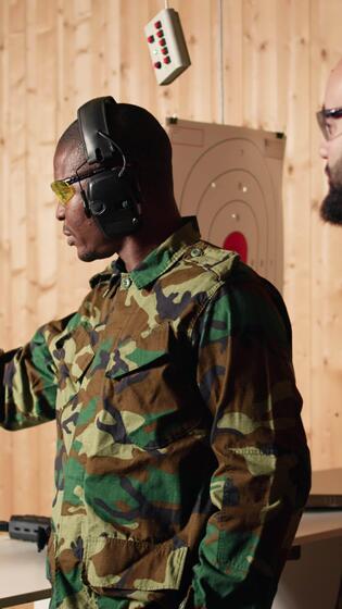 Vertical Portrait of happy army soldiers in shooting gallery looking at targets, comparing points obtained. Cheerful military units testing accuracy in firing range, looking at shot bullseye, camera A Pro Video