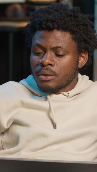 Vertical Black freelancer does his research by reading articles and data driven papers at home, using phone and pc to collect information for a new project. Man multitasking and studying files. Camera A. Pro Video