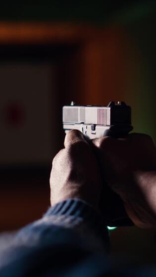 Vertical Man in shooting gallery using firearm, looking at results on moving target. Close up of person training for competitive shooting sport, sharpening skills, checking points scored on bullseye, camera B Pro Video