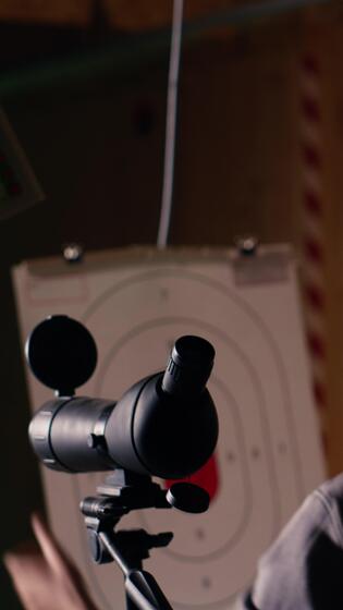 Vertical Firing range client doing shooting activity next to friends, zooming to check if he shot bullseye. Person analyzing targets shot using magnifying lens, comparing results with mates, camera B Pro Video