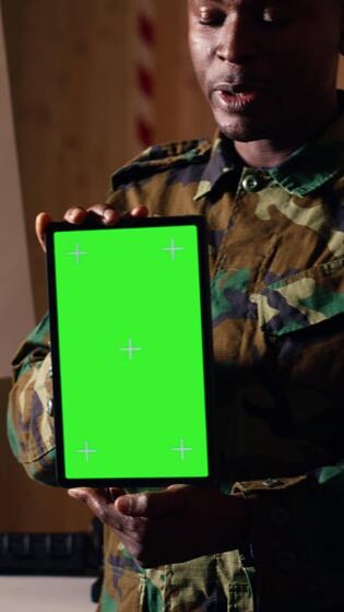 Vertical Team of military units at shooting range watching on green screen tablet to learn necessary combat skills. Army soldiers looking at instructions on chroma key device during training, camera B Pro Video