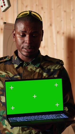 Vertical Team of military units at shooting range watching on isolated screen laptop to learn necessary combat skills. Army soldiers looking at instructions on mockup notebook during training, camera A Pro Video