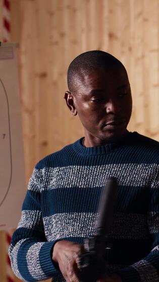 Vertical Shooting range safety officer demonstrating how to safely reload semiautomatic weapon to customers, ensuring they follow rules. Firing range employee teaching proper assault rifle handling, camera B Pro Video