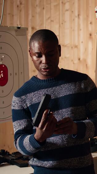 Vertical Shooting range safety officer demonstrating how to safely reload firearms to customers, ensuring they follow rules. Firing range employee teaching proper weapon handling and usage, camera A Pro Video