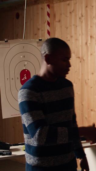 Vertical Shooting gallery worker meeting with customers, greeting them, demonstrating how to safely reload pistol. Firing range expert welcoming clients, doing hand shake, teaching weapon handling, camera A Pro Video