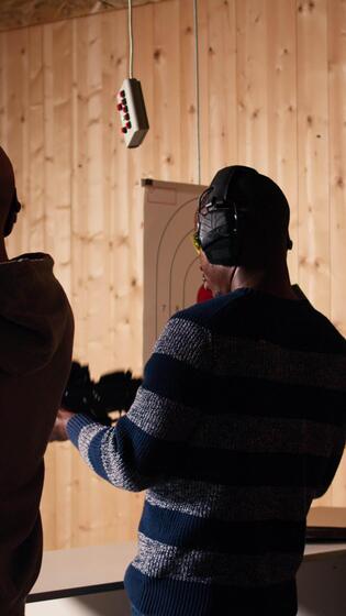Vertical Friends in firing range doing recreational shooting, pressing mechanism to recall paper targets. People training with handguns, sharpening skills, checking points scored on bullseyes, camera A Pro Video