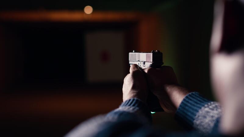 Man in shooting gallery using firearm, looking at results on moving target. Close up of person training for competitive shooting sport, sharpening skills, checking points scored on bullseye, camera B Pro Video