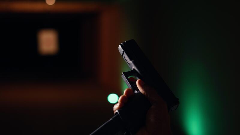 Man reloading handgun in indoor shooting range, following safety protocols. Person carefully handling weapon following methodical firearms practice safety rules, camera B close up Pro Video