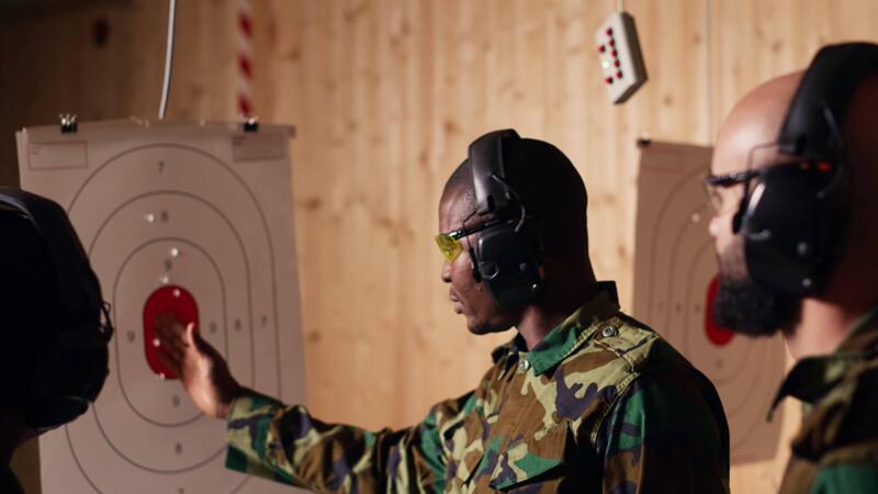 Portrait of happy army soldiers in shooting gallery looking at targets, comparing points obtained. Cheerful military units testing accuracy in firing range, looking at shot bullseye, camera B Pro Video