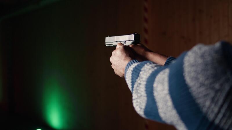 Firing range customer doing shooting activity with pistol, checking if he shot bullseye. Close up of person in shooting gallery learning how to use firearm, analyzing targets shot, camera A Pro Video