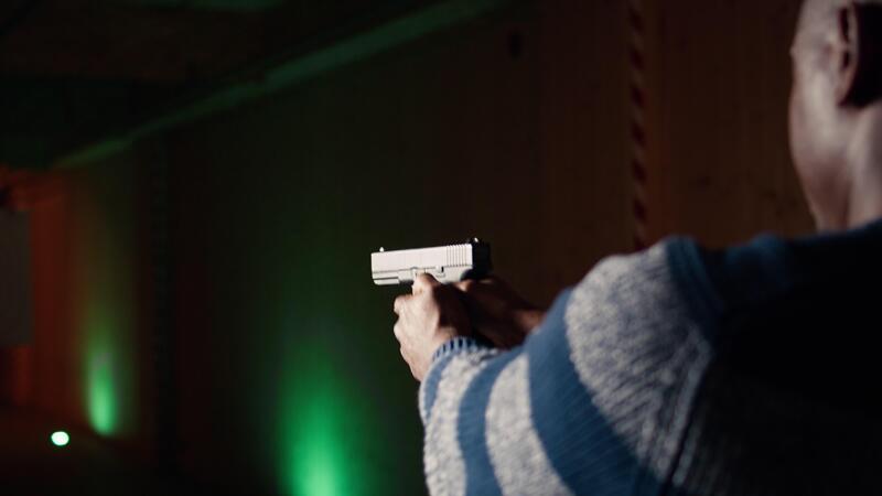 Man in shooting gallery using firearm, looking at results on moving target. Close up of person training for competitive shooting sport, sharpening skills, checking points scored on bullseye, camera A Pro Video
