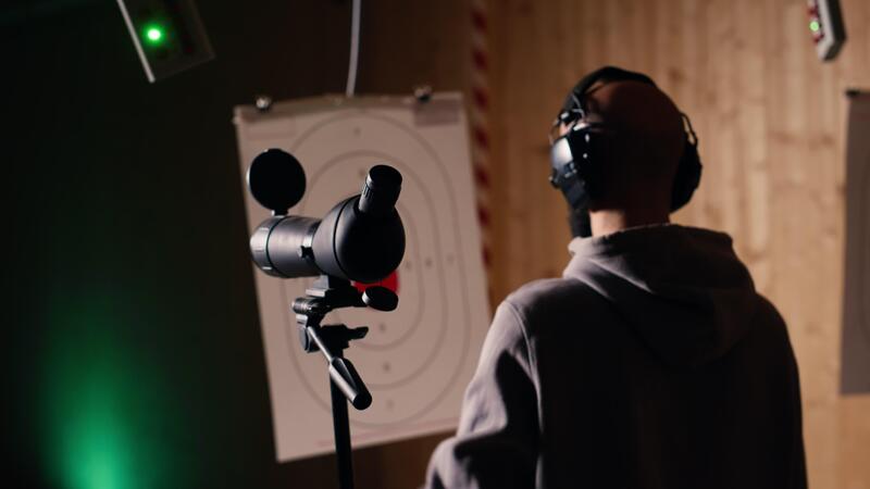 Friends in firing range doing recreational shooting, using magnifying lens to see targets. People training with handguns, sharpening skills, zooming to check points scored on bullseyes, camera B Pro Video