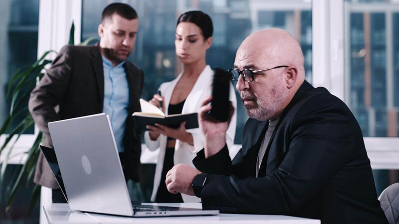 Three diverse business partners having a discussion, working on laptop computer, using mobile phone during meeting at office with large windows showcasing a city skyline. Working together concept Pro Video