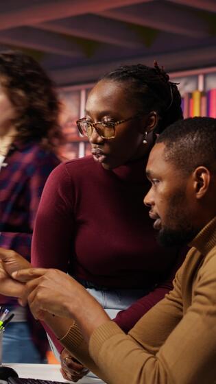 Vertical Teamworking startup engineers brainstorming, working with machine learning tech advancing AI. AI venture business staff members transforming data into predictive models, camera B Pro Video