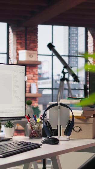 Vertical Empty AI industry startup workplace leveraging machine learning technology. Company office with PC on desk to be used by programmers building scalable solutions for businesses, trucking left shot Pro Video
