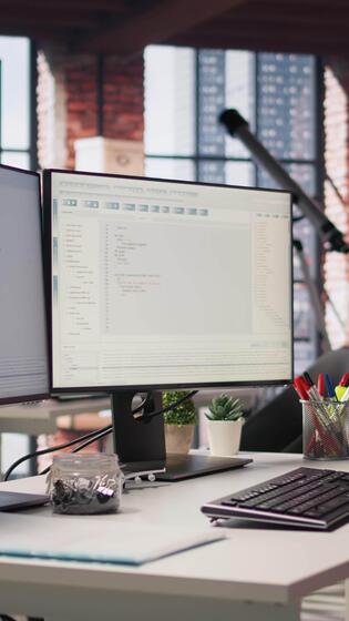 Vertical Empty startup office with PC on desk to be used by programmers building scalable solutions for businesses. AI industry startup workspace leveraging machine learning technology Pro Video