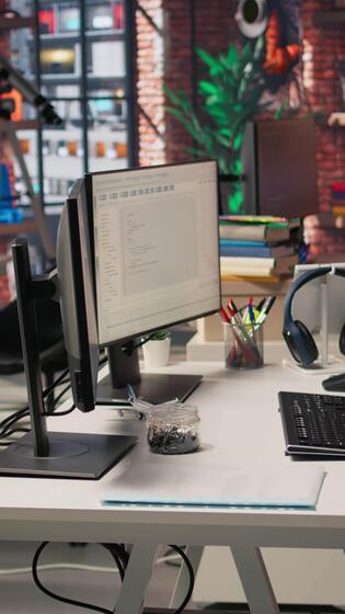 Vertical Empty AI tech agency office providing custom software development services. Technology venture workspace using machine learning to streamline coding process in startup office, jib down shot Pro Video