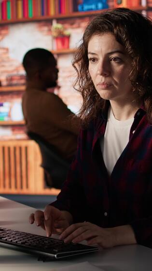 Vertical Portrait of happy woman working in AI tech agency providing custom software development services. Jolly IT staff member using machine learning to streamline coding process in startup office, camera A Pro Video
