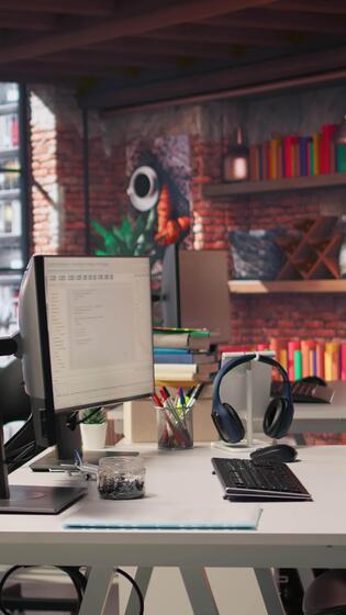 Vertical Empty startup office with program running on PC debugging applications in different software languages. Code testing and quality assurance done on computers in workplace, dolly in shot Pro Video