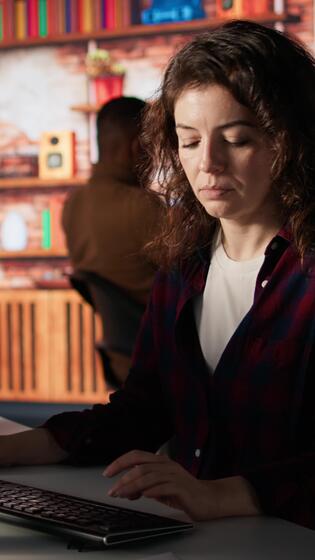 Vertical Portrait of upbeat programmer coding advanced AI algorithm in startup, refining machine learning models to enhance automation. Cheerful woman using coding platform in Silicon Valley office, camera A Pro Video
