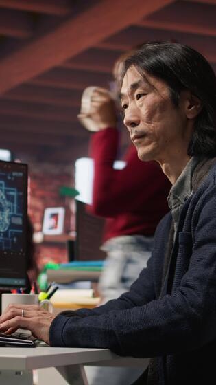 Vertical CTO manager in AI startup drinking coffee while coding applications in programming languages. Chief technician officer enjoying hot beverage while doing code testing and quality assurance, camera A Pro Video