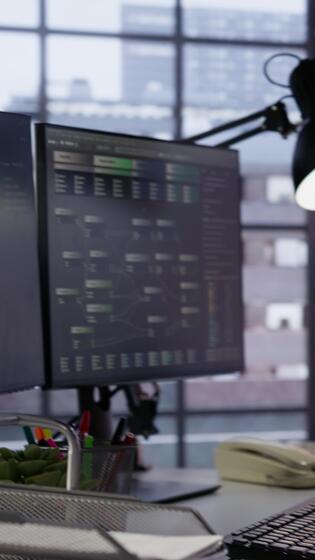 Vertical PC screens in innovative startup office showing programming languages used to build applications. Empty software development agency used for optimizing code on computers, handheld camera shot Pro Video