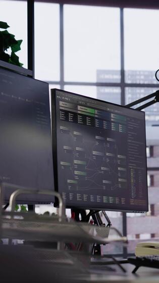 Vertical Empty startup office with program running on PC debugging applications in different software languages. Code testing and quality assurance done on computers in workplace, dolly in shot Pro Video