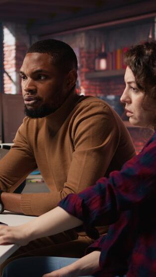 Vertical IT employees in startup office working at computer desks, testing and deploying programs and systems. Programmer and developer checking code on desktop PCs, solving tasks in workspace, camera A Pro Video