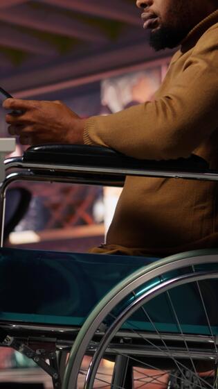 Vertical Engineer with disability coding AI algorithms in inclusive startup office using tablet, refining machine learning models. Man in wheelchair coding on device in Silicon Valley workplace, camera B Pro Video