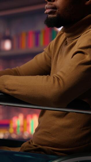 Vertical Man in wheelchair working in inclusive AI tech agency providing software development services. IT worker with disability using machine learning to streamline coding process in startup office, camera B Pro Video